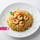 Basic fried rice cooked with chilli paste, fresh prawns, egg, dark soy sauce and leafy greens