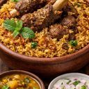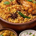 Authentic Dindigul biriyani prepared with Basmati rice,slow cooked chicken,and freshly ground spices with flavorful Mutton Dhalcha,Onion Raita .