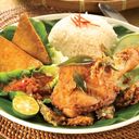 Deep fried marinated chicken served with plain white rice and authentic spicy sambal