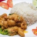 Tangy and savory lemon chicken with a crispy coating, served with steamed rice.