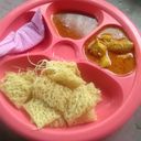 Savory rice cakes paired with aromatic chicken curry, delivering a delightful blend of flavors.