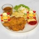 Savory fried rice topped with tender chicken chop, served with fresh vegetables and a spicy sauce.