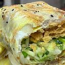 Savory omelette filled with tender, seasoned meat, served with a crispy, golden pancake.