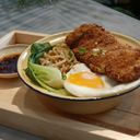 Breaded chicken chop served with our freshly handmade noodles tossed in a simple blend of sauces and aromatics, Comes with a sunny side up egg that breaks to coat your noodle with a delicious layer of creamy yolk