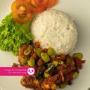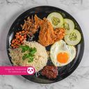 Fragrant rice cooked in coconut milk, served with anchovies in spicy sambal with stinky beans, and other condiments