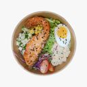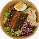 Brown rice, lettuce, signature mashed potatoes, cherry tomatoes, purple cabbage, apple, edamame, corn, and MaCao egg.