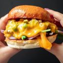 Spicy burger topped with melted cheese, fresh lettuce, and zesty sauce on a toasted bun.