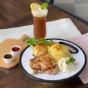 Delight in a juicy chicken chop served with fragrant fried rice, two appetizing side dishes, and a refreshing drink.