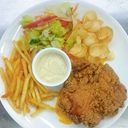 Golden-fried crispy chicken chop with a crunchy coating and juicy, tender meat inside, Served with Crispy Fries, Crunchy Keropok Panda, Fresh Garden Salad, and a side of Garlic sauce for dipping.