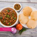 Spiced chickpeas served with fluffy deep-fried bread, accompanied by tangy pickles and cooling yogurt.
