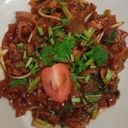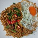 Maggi dengan lauk ayam beserta sayur sawi/kangkung dan hirisan cili